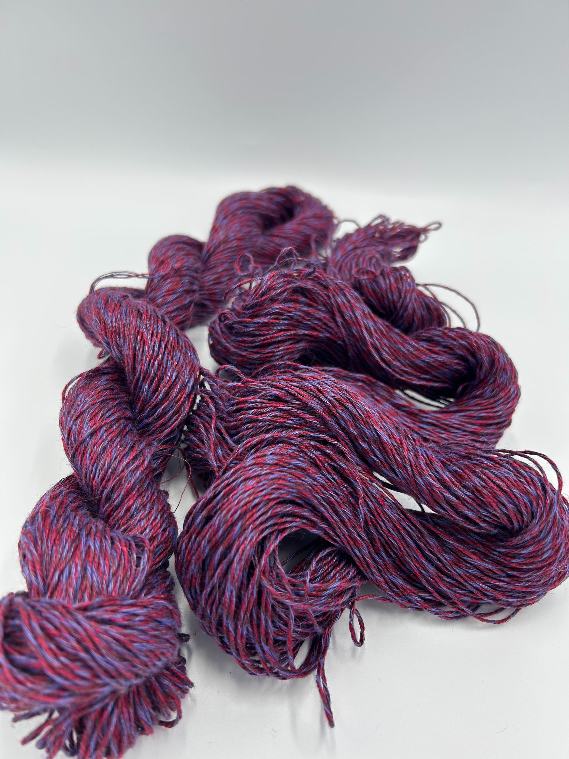 100% linen yarn, 100% hand processed in small batches in the color way Mixed Berry at our New Hampshire fiber farm, creating crisp, breathable stitches with beautiful drape for shawls, lightweight garments, and warm-weather accessories.